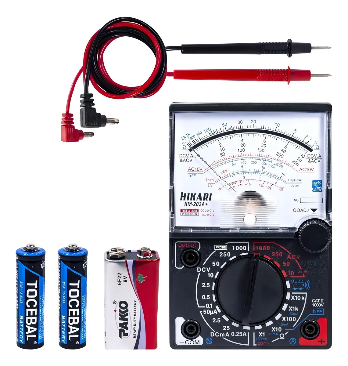 O Multímetro Analógico CAT II 1000V HM-202A+ é rápido na resposta, pode ser utilizado em bancadas para medir circuitos eletrônicos e ambientes monofásicos protegidos, tomadas e interruptores.